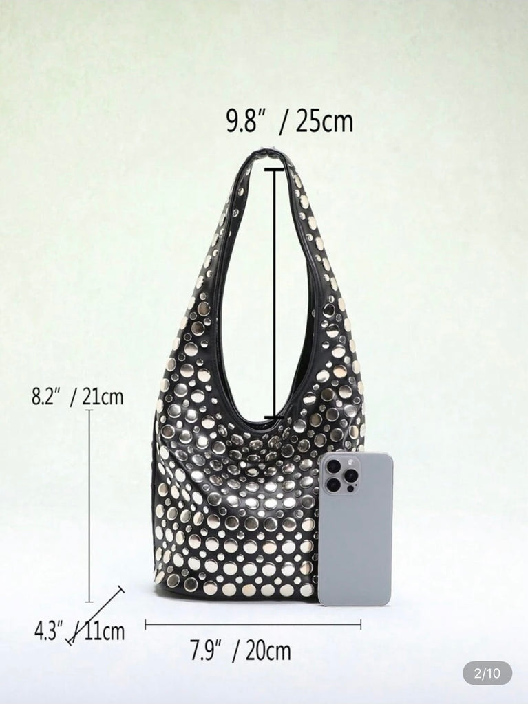 1European& American Punk Style Heavily Embellished Double-Sided Round Riveted Inlaid Niche Luxury Bucket Bag, Elegant Bag